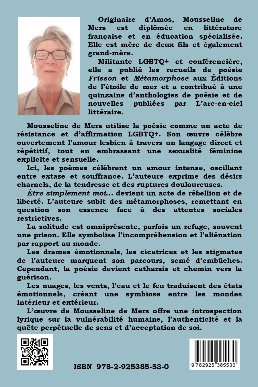 Mousseline de Mers utilise la poésie comme un acte de résistance et d’affirmation LGBTQ+. Son œuvre célèbre ouvertement l’amour lesbien à travers un langage direct et répétitif, tout en embrassant une sexualité féminine explicite et sensuelle.