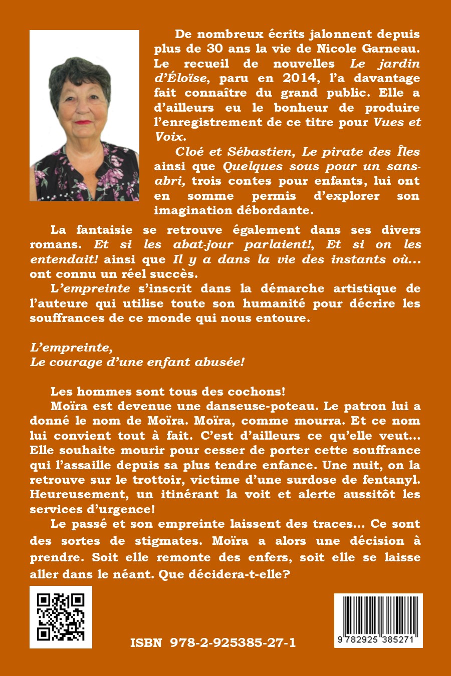 L’empreinte s’inscrit dans la démarche artistique de l’auteure qui utilise toute son humanité pour décrire les souffrances de ce monde qui nous entoure.